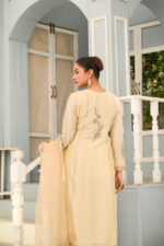 This silk beige angrakha showcasing intricate resham and zardozi handwork is accentuated with delicate dark skin finishing patti the angrakha is paired with plain korean raw silk pants and organza dupatta with gota patti work.