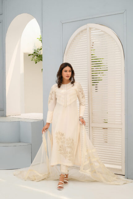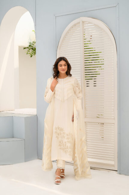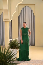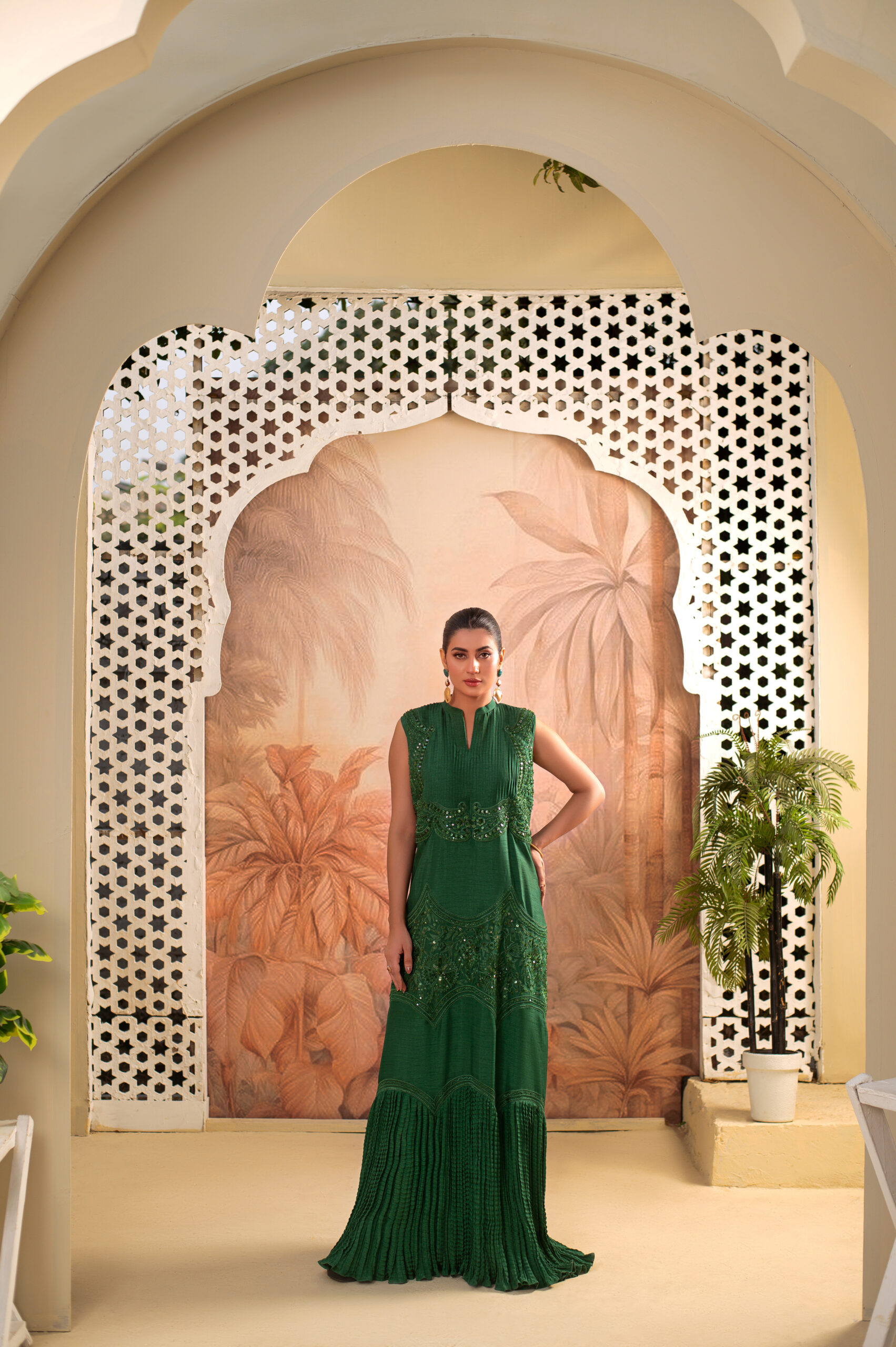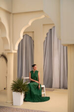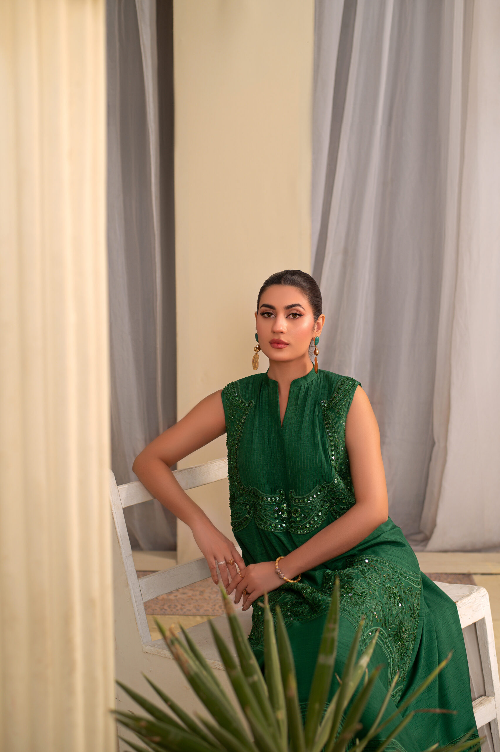 Elegance meets tradition with DE LUXE our emerald green frock with a textured border, The delicate cutwork embroidered jaal adds exquisite detail. Make a statement, stand out, and let your style shine.