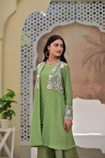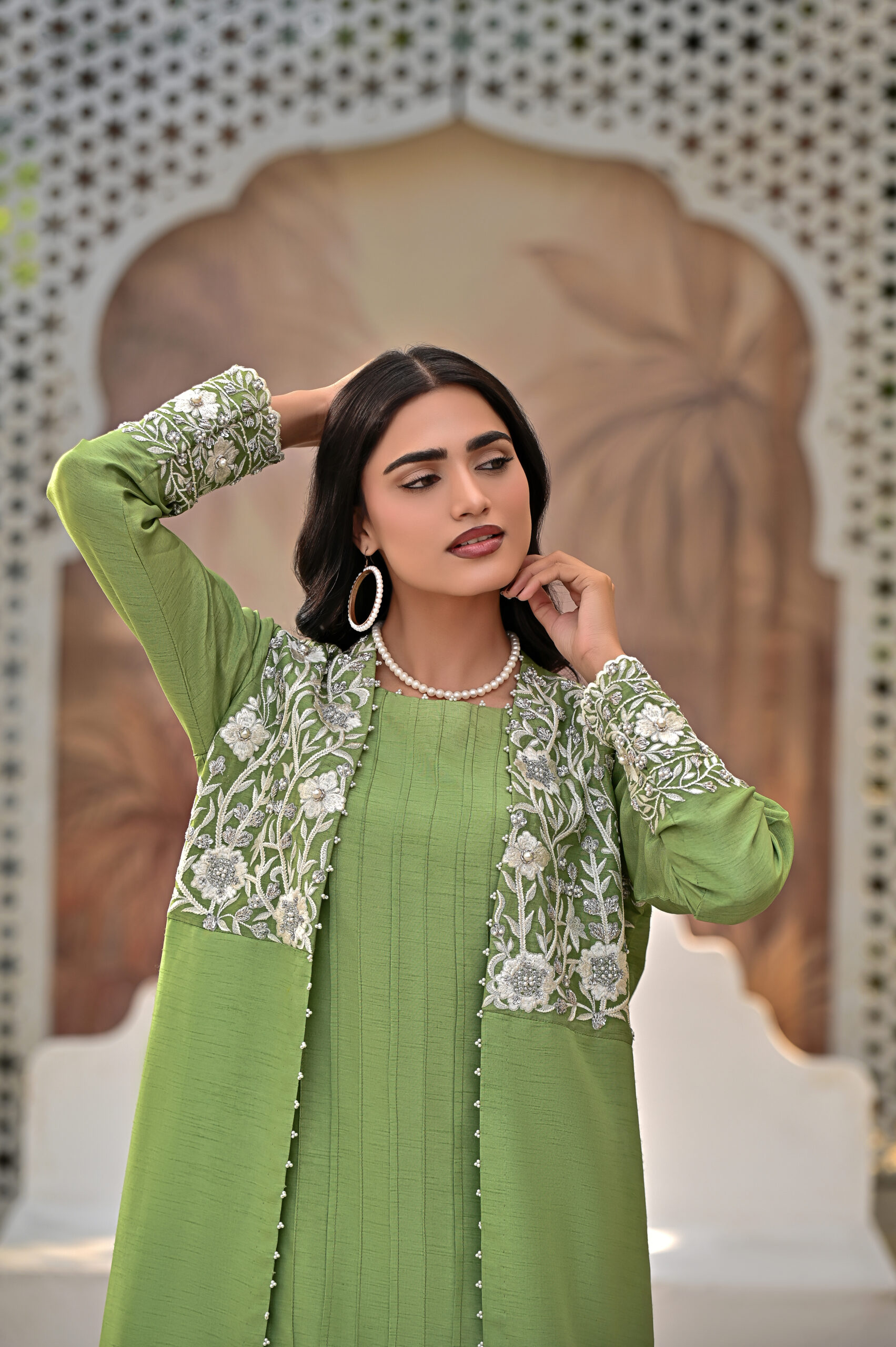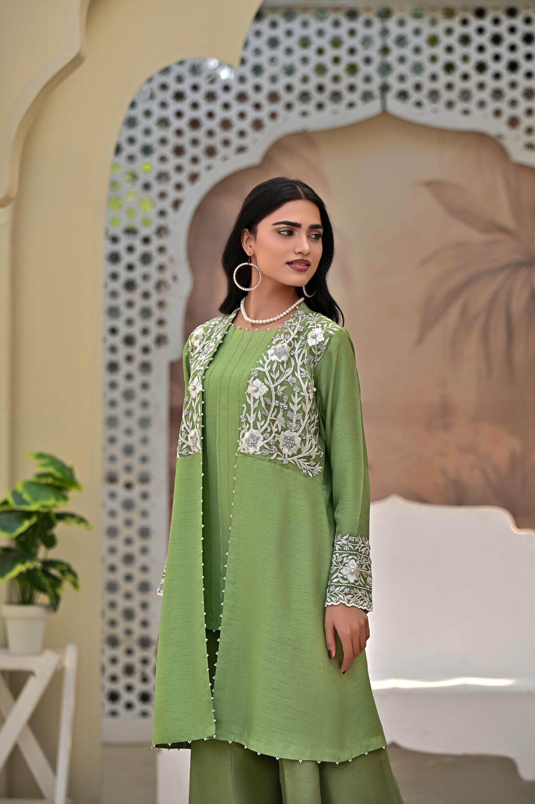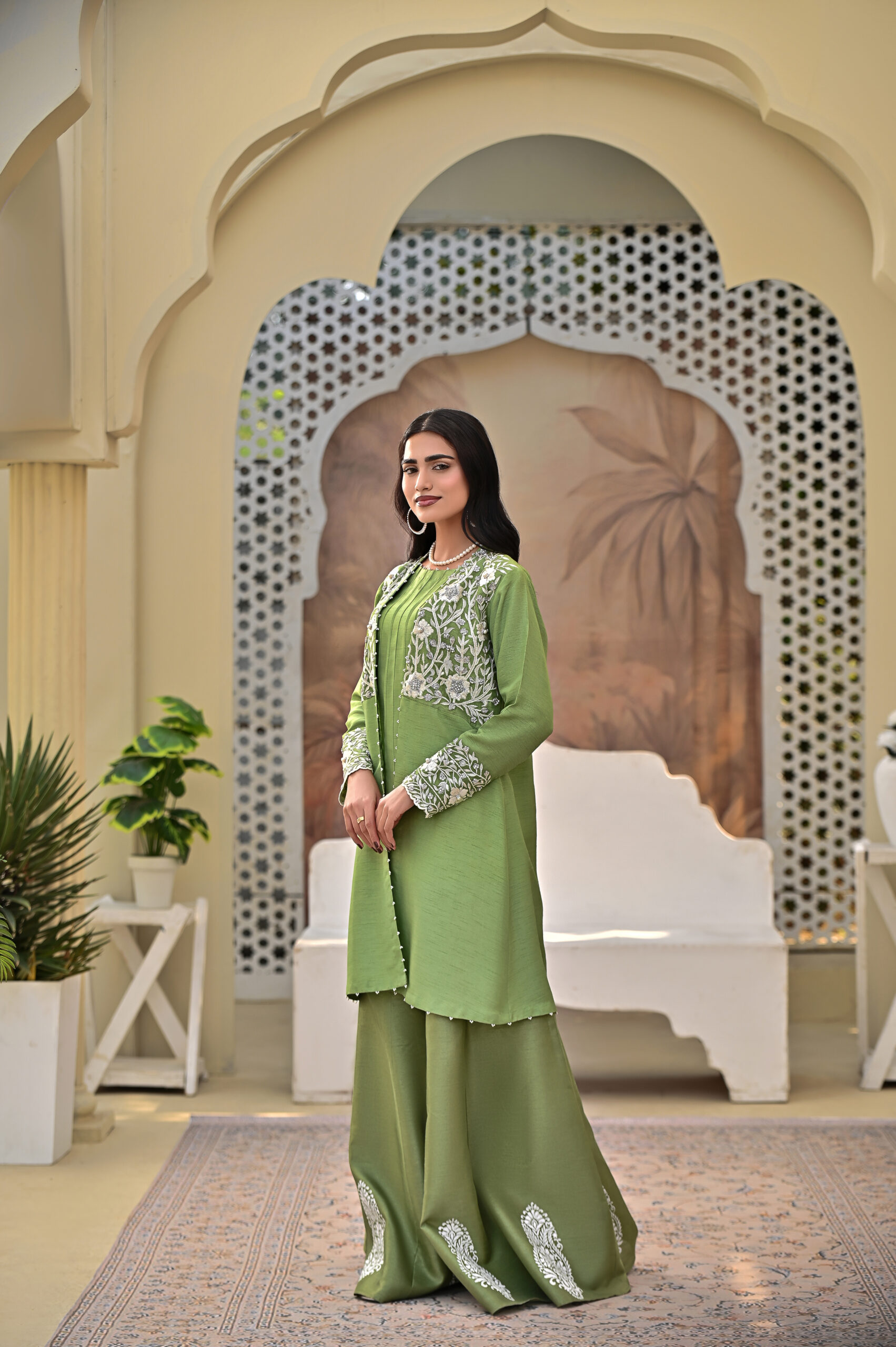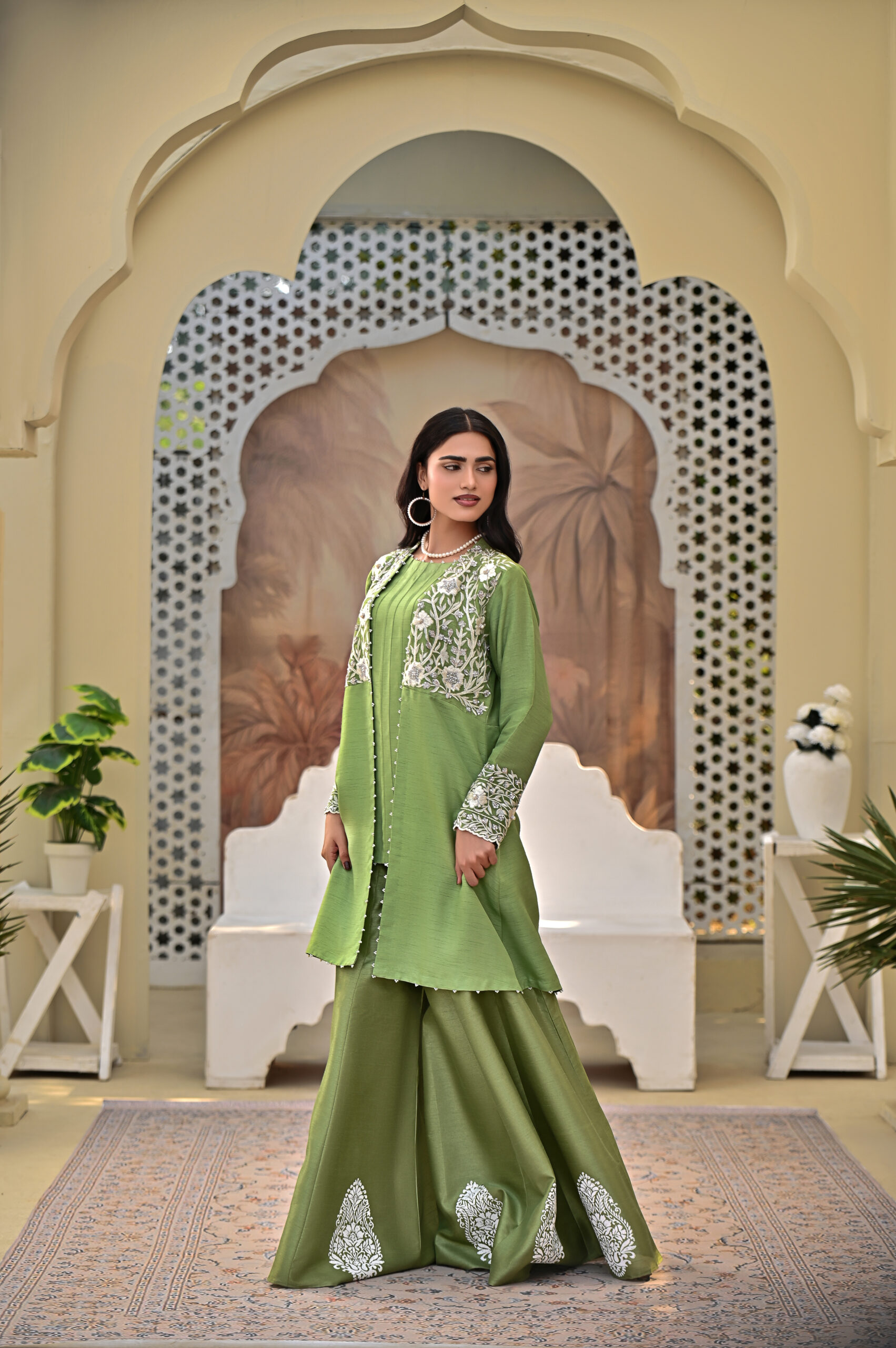 The olive green outfit features intricate anchor and thread work, complemented by the graceful addition of pearls and mirror accents. Complete the look with a dupatta and silk block print sharara pants.
