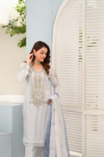 A beautiful fusion this ensemble is crafted from luxurious korean raw silk for both shirt and pants, offering a refined and polished look paired with a chifoon dupata with embroidery