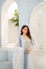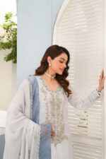 Light grey silk with dabka pearls sequence work complete this outfit with embellishment shalwar a pure silk dupatta with work shirt length 40