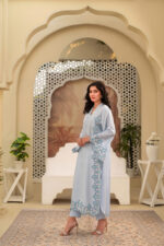 Sky blue Raw silk outfit with cutwork and sleeves border. The shirts front and sleeves has embroidery