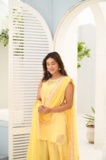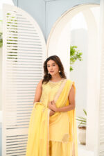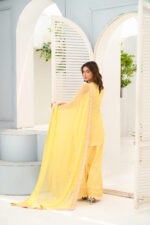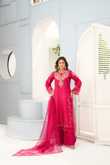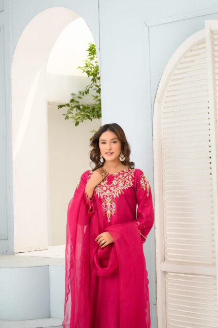 A beautiful fusion this ensemble is crafted from luxurious korean raw silk for both shirt and pants, offering a refined and polished look paired with a chifoon dupata with embroidery