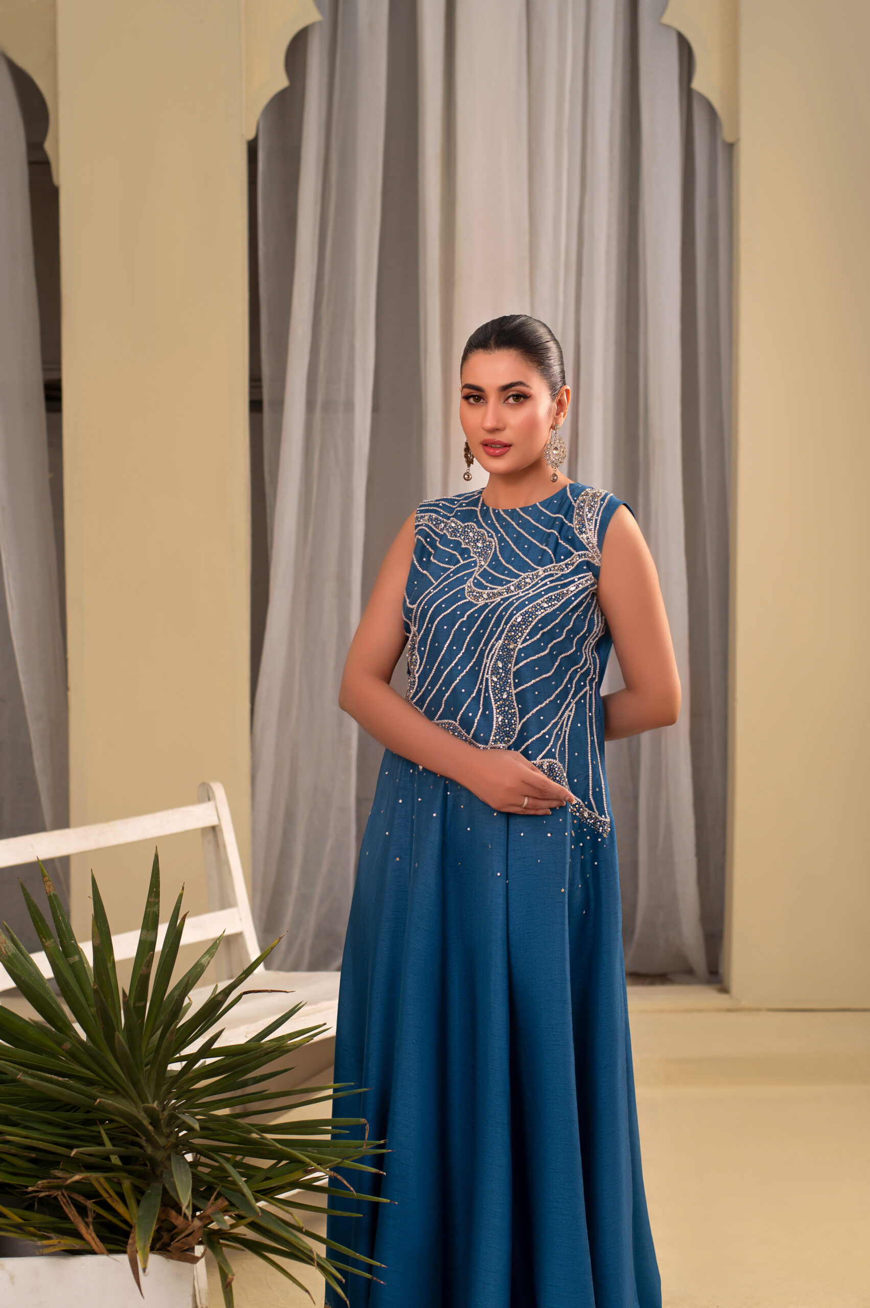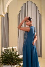 This dress has beautiful color adorned with intricate handwork. This long style frock is uplifted with contemporary embellishment and design. The motif is spread from one shoulder to waist.daman has block print
