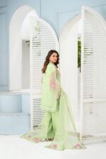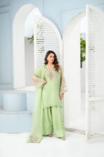 Elegance meets intricacy with this sea green ensemble adorned with exquisite embroided with embellishment beautifully complemented by the soft pure organza. complete your look with the ethereal touch of organza dupatta with embroider. The shirt length 33 with soft korean raw silk shalwar