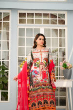 This beautiful red printed shirt is a cut from korean raw silk, this gorgeous tunic adorned with delicate embroidery is a must have to make an impact. shirt length 50 with raw silk sharara pure organza dupatta