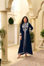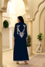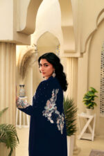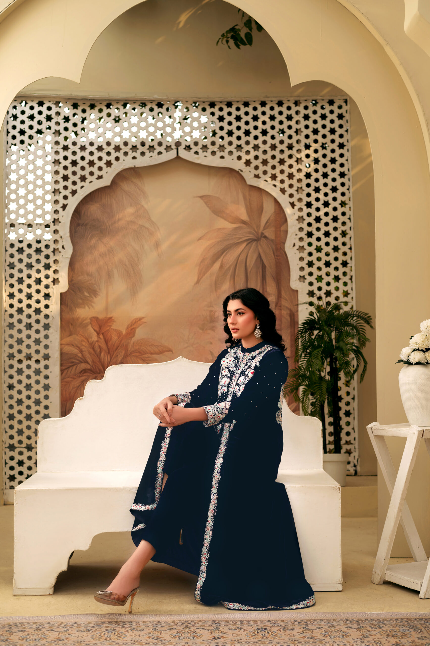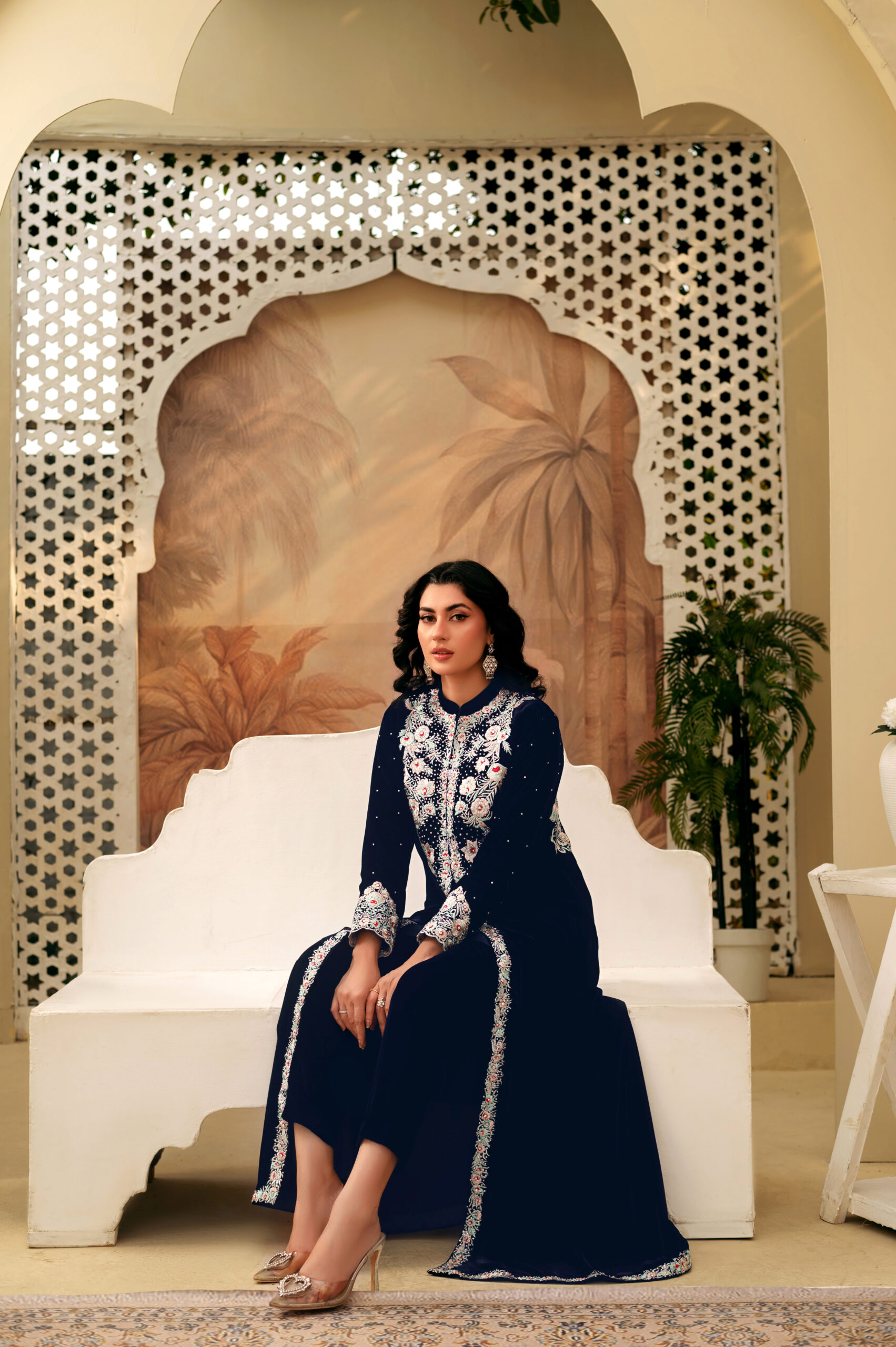 Navy blue velvet becomes a canvas for hand-done zardozi and thread work with multi colour and hand embroidery