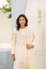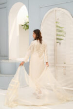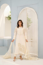 Elegant off white meticulously embroidered cut-work with embellishment pearls sequence work korean silk shirt A perfect addition to your summer wardrobe. it is paired with organza design dupatta